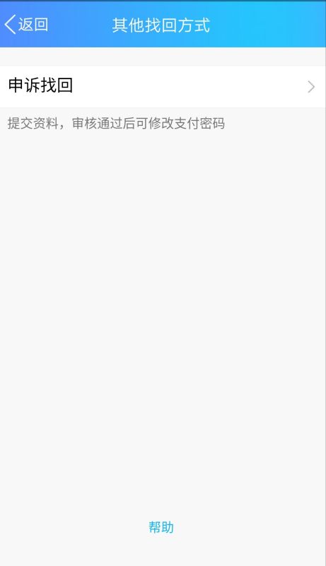 (4)如遇其他情况,点击右上角的无法找回,里面有一个申诉找回,按照步骤来,申诉成功后,就可以重新设置支付密码了。