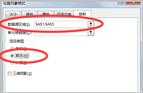3、在打开的设置窗口中选择数据源区域为需要显示的数据单元格,勾选“复选”,点击确定。