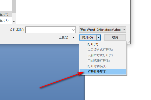 5、最后,点击打开按钮下拉菜单中的打开并修复即可。