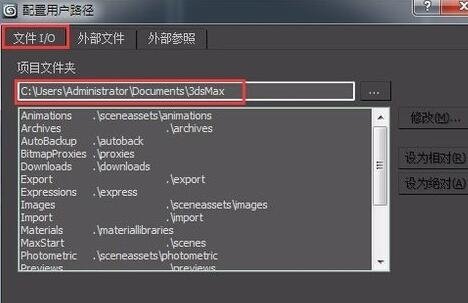步骤二、根据3dmax版本不同,闪退没保存的文件位置目录也不一样。我们可以打开3dmax软件,点击工具栏上的“自定义”—“配置用户路径”。在“文件I/o”—“项目文件夹”下复制3dmax闪退没保存找回文件路径。