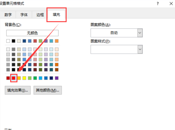 5、这时会弹出“设置单元格格式”对话框,在对话框中选择“填充”选项卡,将填充色选择为大红色,完成后单击确定按钮。
