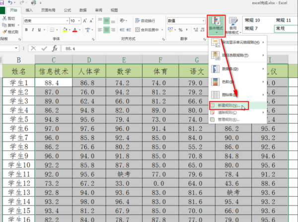 1、打开学生excel成绩表,用鼠标从头到尾将全部学生每门科目的分数全部框选。