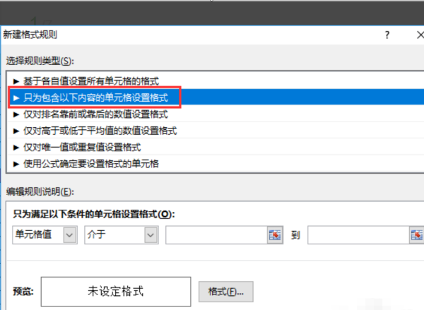 3、单击该命令后,弹出“新建格式规则”对话框。在对话框中的“选择规则类型”选项中我们单击选择“只会包含以下内容的单元格设置格式”项。