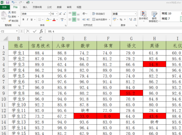 7、完成后,可以看到所有低于60分的单元格就批量填充为大红色了。