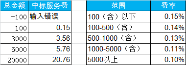 A2为总金额,B2为中标服务费,则B2=IF(A2>5000,100*0.15%+400*0.14%+500*0.13%+4000*0.11%+(A2-5000)*0.1%,IF(A2>=1000,100*0.15%+400*0.14%+500*0.13%+(A2-1000)*0.11%,IF(A2>=500,100*0.15%+400*0.14%+(A2-500)*0.13%,IF(A2>=100,100*0.15%+(A2-100)*0.14%,IF(A2>=0,A2*0.15%,"输入错误")))))