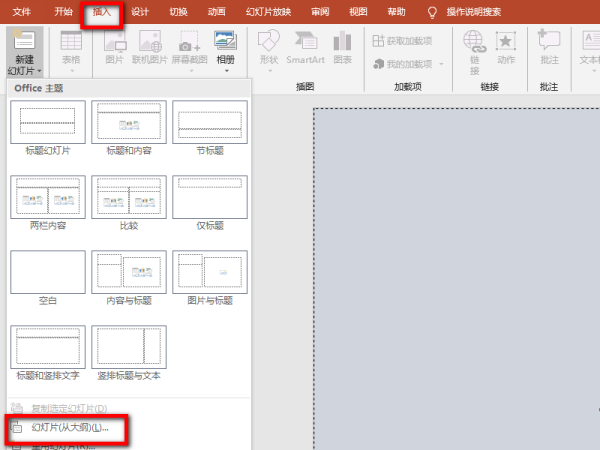 第四步,找到上方菜单的插入-幻灯片从大纲点击选择需要加载的word文档。