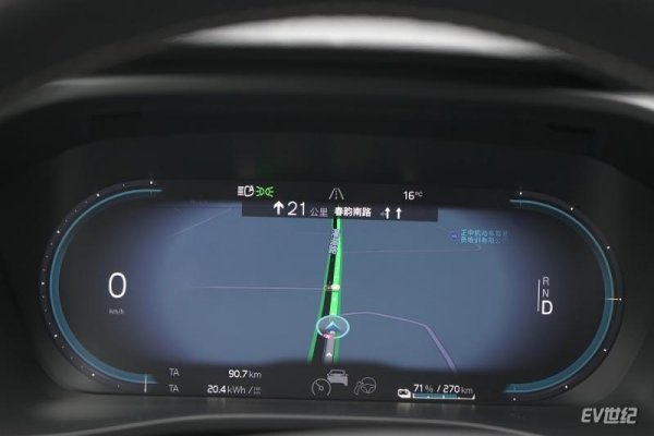 又行驶了13.3km之后,剩余电量降至71%,可用续航降至270km,换算一下车辆满电续航降至380km,实际百公里电耗在20kWh上下。考虑到我们的试驾道路既有城市拥堵路段,又有高速路段,并且全程开启了空调(温度保持在23度),这个续航能力还是让人满意的。