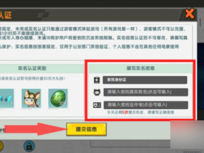 4.根据国家制定的条例规定,未完成实名认证的用户只能通过游客模式体验游戏(所有游戏都一样),游客模式不可以充值,累计体验1小时后不能继续游戏。为保护未成年人身心健康,未满18周岁用户将受到防沉迷系统限制。实名信息认证后不可修改,请填写真实信息。