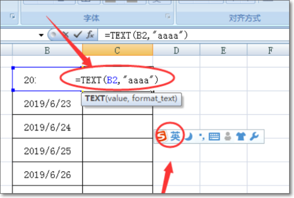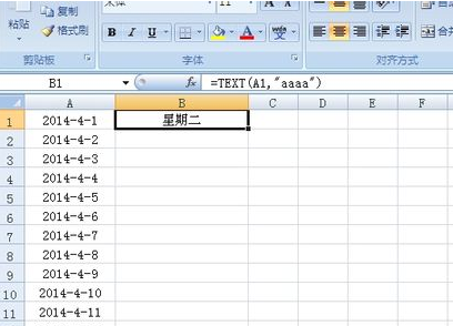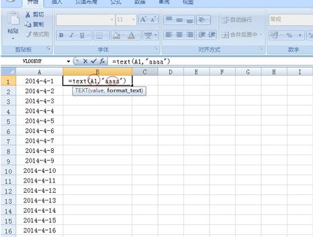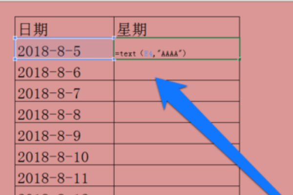 2、这个函数的公式是:=text(A1,"aaaa"),公式中的A1只的是日期单元格,需要注意的一点是,双引号必须是在英文状态下的双引号。