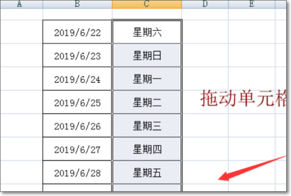 6、最后拖动第一个得出的单元格自动填充下面的其他日期,这样就可以一键计算所有日期星期几,如下图。