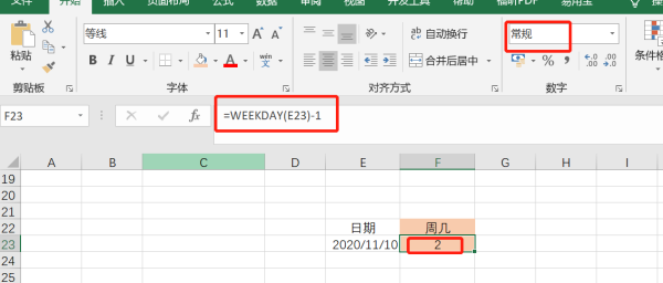 3、该单元格显示出的数值及为周几,如下图显示2,即为周二