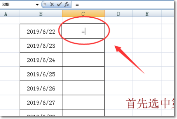2、先选择第一个日期的对应单元格,输入=号,如下图。