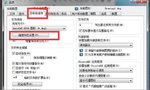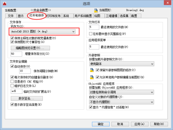 工具-选项,打开“选项”对话框,如图所示,切换至“打开和保存”选项卡,设置“另存为”为“AutoCAD 2013图形”,单击确定按钮关闭对话框。