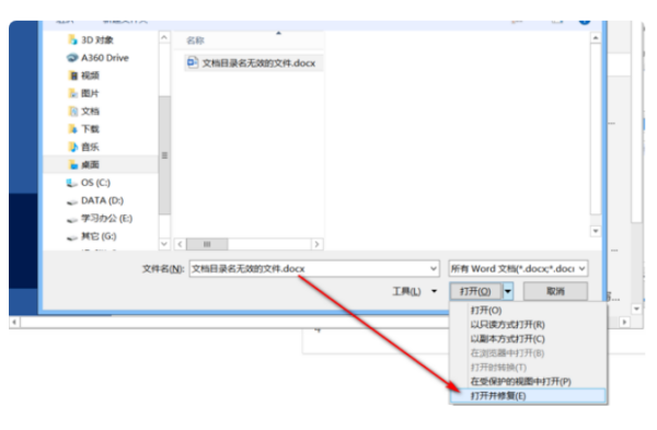 微信文件word打开目录名无效的原因是文件已损坏,可以尝试使用word软件的文件修复功能来修复它。具体操作步骤如下: