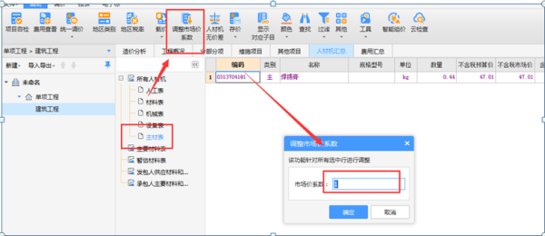 方法三:在人材机汇总界面选中要调整的工料机表,选中要参与调整的工料机,点【调整市场价系数】,输入系数点确定即可。