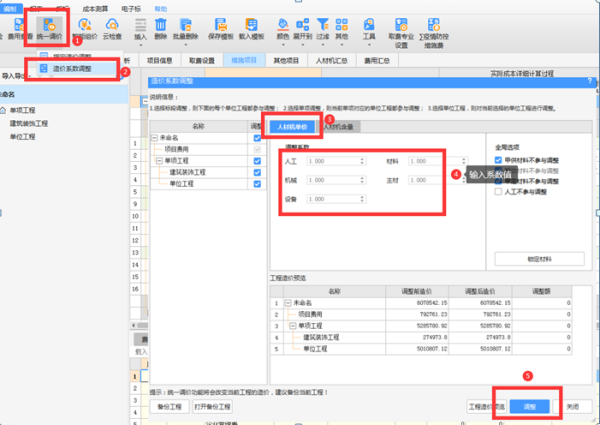方法二:点击【统一调价】---选择造价系数调整---选择人材机单价---给工料机输入系数即可。如图: