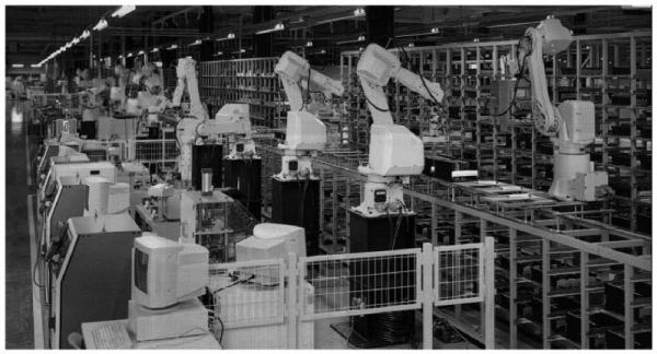 50年代末到60年代初,开始出现电子数字计算机控制的自动化工厂,60年代末在制造工业中出现了许多自动化生产线(图4-13),工业生产开始由局部自动化向综合自动化方向发展。70年代以来微电子技术﹑计算机技术和机器人技术的重大突破,促进了综合自动化的迅速发展。过程控制方面,1975年开始出现集散型控制系统,使过程自动化达到很高的水平。制造工业方面,在采用成组技术﹑数控机床﹑加工中心和群控的基础上发展起来的柔性制造系统(FMS)及计算机辅助设计(CAD)和计算机辅助制造(CAM)系统成为工厂自动化的基础。70年代开发出来的一批工业机器人﹑感应式无人搬运台车﹑自动化仓库和无人叉车成为综合自动化的强有力的工具。柔性制造系统是从60年代开始研制的,1972年美国第一套柔性制造系统正式投入生产。70年代末到80年代初柔性制造系统得到迅速的发展,普遍采用搬运机器人和装配机器人。1982年10月在英国的普赖顿召开第一届柔性制造系统国际会议。