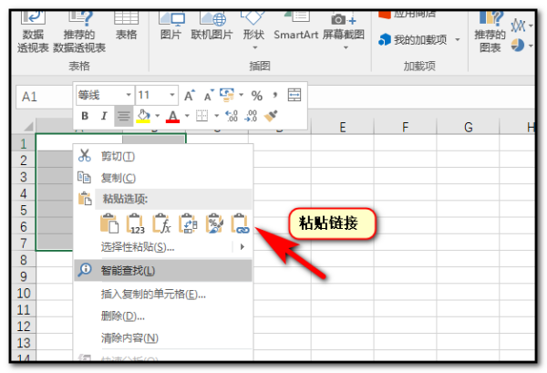 2、在表2里点击右键在“粘贴选项”里选择“粘贴链接”按钮即可。