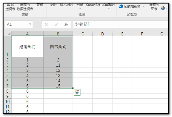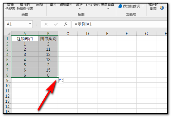2、通过右下角的“填充选项”来下拉或右拉填充表1的数据。这时修改表1数据是同步到表2的。