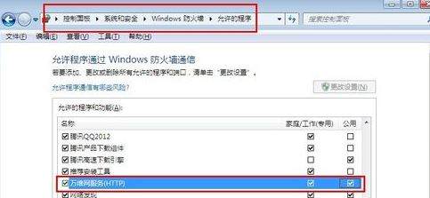 4、设置防火墙,让局域网当其它计算机也能访问本地网站资源。具体方法:打开控制面板,选择“系统和安全”,点击“允许程序通过Windows防火墙”,在弹出的对话框中勾选“万维网服务HTTP”右侧的两个复选框,最后点击确定退出。