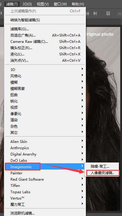 ⑤安装完成以后打开PS,导入要磨皮的人像,在菜单栏“滤镜”里面找到“Imagenomic ”--“人像磨皮滤镜”