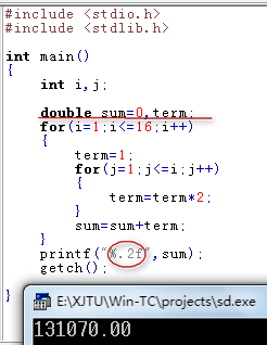 你要求的是2^1+2^2+2^3+。。。+2^16。前面2的几次方的时候值比较小,int类型的term还能装的下;后面的数越来越大,不仅超出了int类型的term最大长度,还超出了long类型的sum的最大长度。因此输出的是无符号long类型的最小值0。