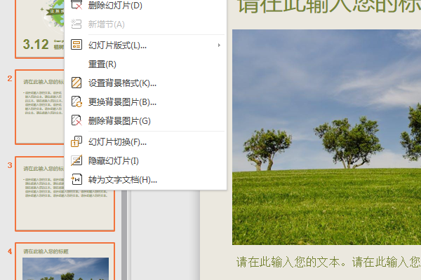 4、在选中的幻灯片上点击鼠标右键,弹出右键菜单。