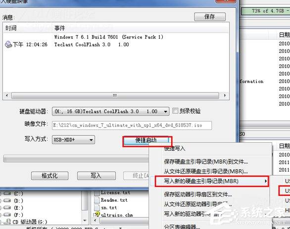 5、格式化U盘后,点击“便携启动”,选中“写入新的硬盘主引导记录”,然后选择“USB-HDD+”。