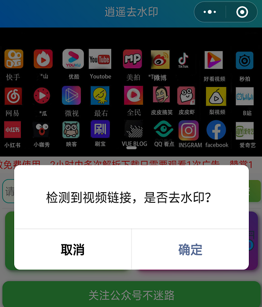 2、然后打开微信搜索【逍遥去水印】点击进入,这时就会自动读取我们的粘贴板内容,无需我们手动粘贴,是不是非常的人性化?我们点击确定即可开启解析。