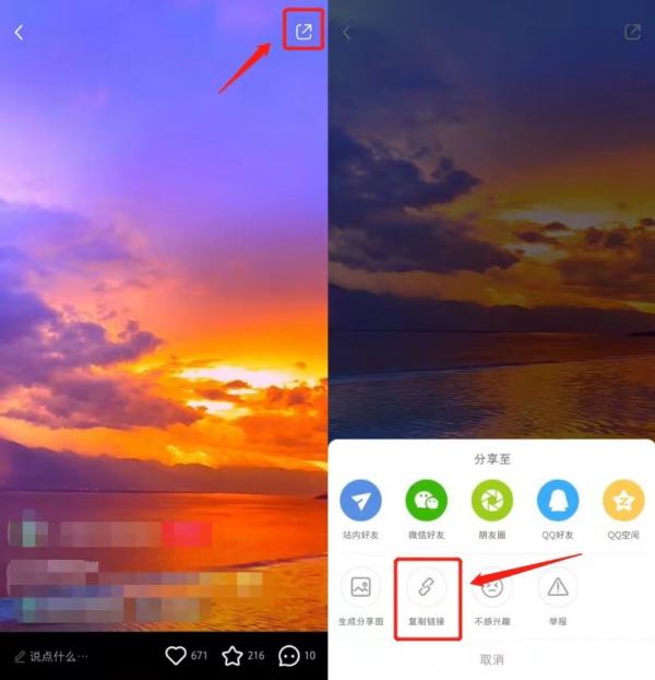 第一步:找到要保存的图片或视频,点击分享按钮,复制链接。
