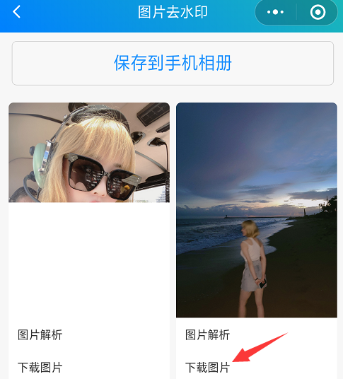 3、解析完成后就到了下载界面,是以图片给大家演示的,所以出现的是图片下载保存界面,如果是视频就是视频保存界面。点击下载图片即可将无水印的图片保存的相册。