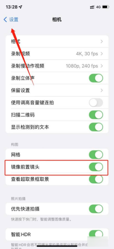苹果手机:打开手机设置;点击相机;开启镜像前置镜头即可。