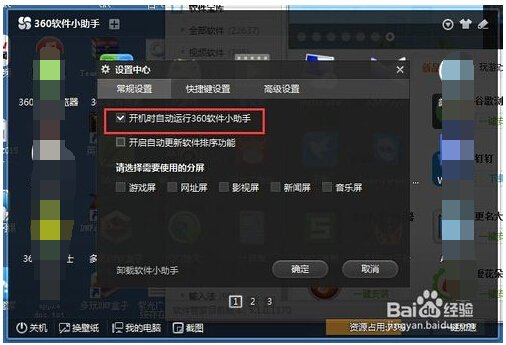 5、在“设置”功能中,确保选中“开机时自动运行360软件小助手”的复选框,其它的复选框不建议选择。