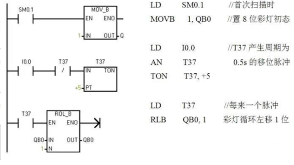 即要求字节QB0中的“1”用循环左移位指令每0.5s移动一位,因此须在ROL-B指令的EN端接一个0.5s的移位脉冲(可用定时器指令实现)。