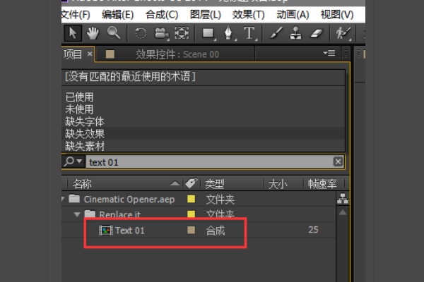 1、首先我们在项目窗口里面搜索合成“Text 01,找到之后双击点开。