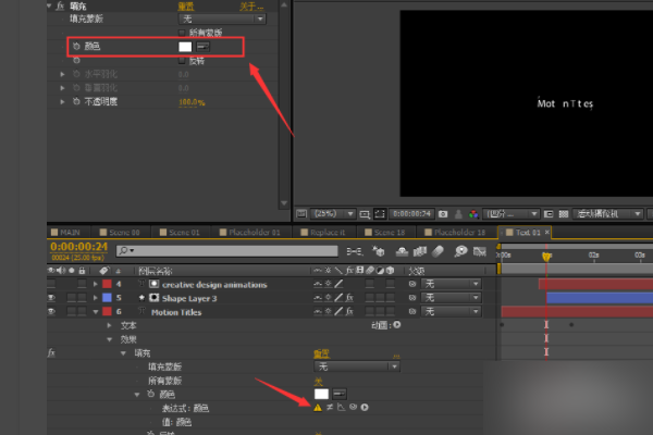 3、选中图层6之后,在效果控件里面双击颜色就会的打开表达式位置,或者选中图层连续按两下e键就可以打开表达式位置。可以看到在表达式颜色后面有一个小黄色的图标,那个就是代表这个表达式有问题。