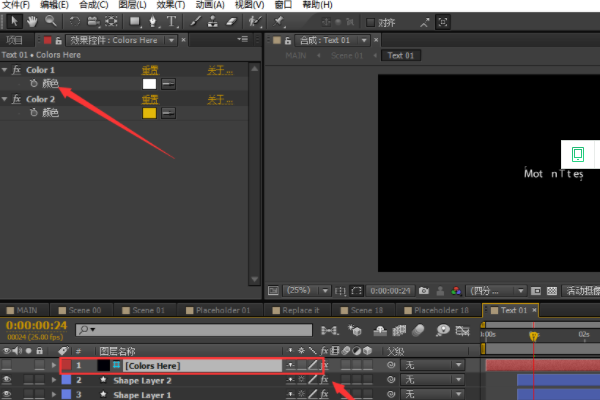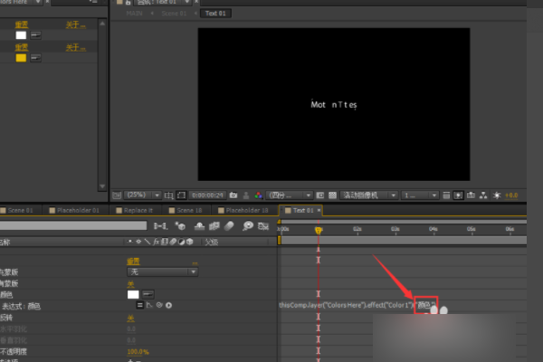 4、在这个合成里面找到名为”Colors Here“的图层的图层,找到之后在效果控件栏里面找到名为“Color 1”的效果,在这个效果下面有一个名为“颜色“的属性把表达式里面的英文改为”颜色“就可以了,或者可以直接选中表达式 从新链接到颜色上都可以。