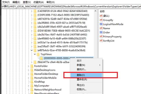 5、接着依次点击“HKEY_LOCAL_MACHINE->SOFTWARE->Wow6432Node->Microsoft->Windows->CurrentVersion->Explorer->FolderTypes->{ef87b4cb-f2ce-4785-8658-4ca6c63e38c6}->TopViews->{00000000-0000-0000-0000-000000000000}”。