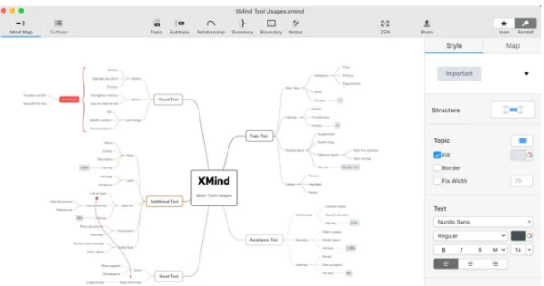 2、Xmind:主流的轻量化思维导图工具,编辑界面简洁,可绘制思维导图,鱼骨图,二维图,树形图,逻辑图,组织结构图。虽是商业软件,但大部分核心功能免费使用。