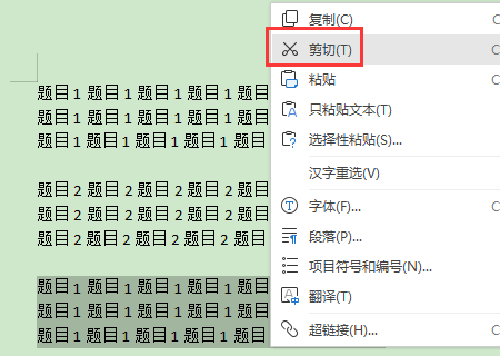 6、然后在该界面中,选中重复的题目,右键点击“剪切除”选项。