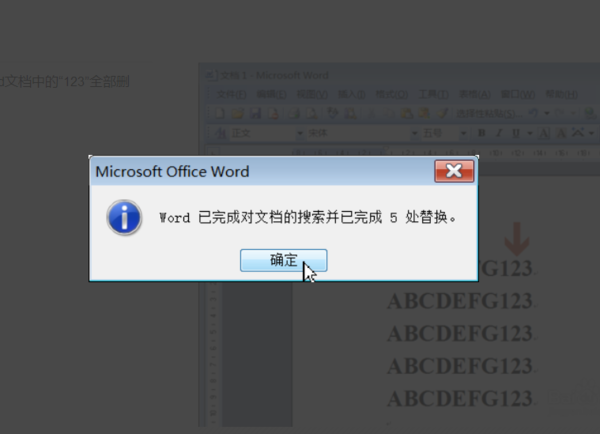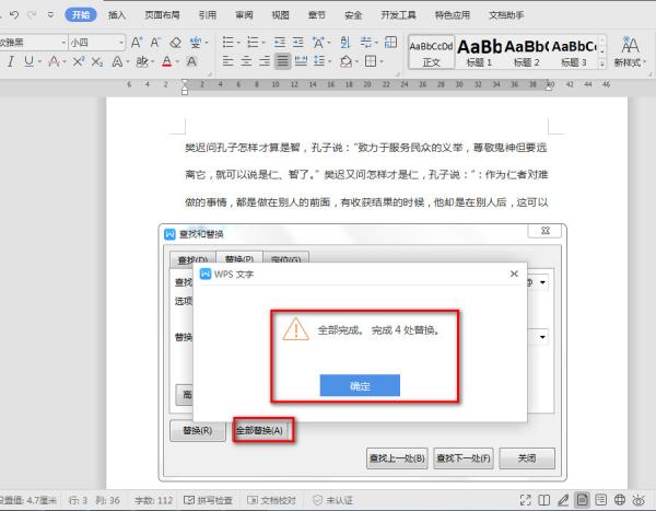 5、输入完成后,点击“全部替换”,替换完成则会弹出替换完成的选项,点击确定后,关闭“查找和替换”。