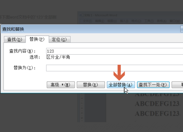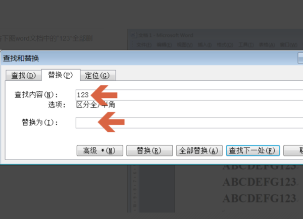 3、打开替换窗,查找内容为要删除的重复部分,替换为框不填留空;