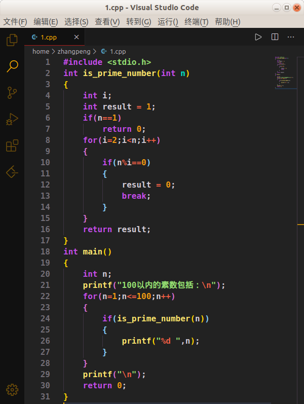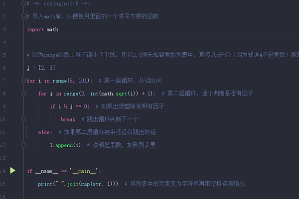 for(i=2;i { if(n%i==0) { result = 0; break; } } return result; } int main() { int n; printf("100以内的素数包括:\n"); for(n=1;n<=100;n++) { if(is_prime_number(n)) { printf("%d ",n); } } printf("\n"); return 0; } 1、打开pycharm,点击file,点击new,新建一个空白的pyrthon文件: 2、这里开始编写判断素数的代码,判断素数的上限最准确的应该使用平方根取整加一,此处用到两层循环,第一层遍历0到100的数,第二层循环判断满足条件的素数。这里有一个else要注意是和for对齐而不是if对齐,如果和if对齐只要不能被2整除就会被添加到列表中了,而且会多次添加: 3、右键点击鼠标,点击“rundemo”,运行编写好的python文件,在下方的控制台就可以看见输出后结果: 相关文章 Excel2021power piovt添加到数据模型后没有链接表怎么解决?如果在Excel2021中添加了Power Pivot数据模型,但没有链接表,可以按照以下步骤解决: 1. 确保数据源已正确连接到Excel 在Excel 工作表中,如何用函数调用另一个工作表中的符合条件的数据通过以下十一步就可以实现从另一个工作表中调用符合条件的数据:第一步:在C2单元格输入函数=vlookup(),单击插入 作业帮在台式机怎么做作业1、在搜索引擎上搜索并下载安卓模拟器bluestacks蓝叠,然后安装这个软件。 工作中最常用的12个函数公式是什么?关于excel中日常工作需要的一些函数公式:1、abs函数函数名称:abs 。主要功能:求出相应数字的绝对值。使用格式:abs(number) 。参数说明:number excel中if函数如何使用对于学习Excel的同学来说,了解Excel函数最开始接触到的应该就是IF条件判断函数。这个函数在实际运用中也是非常的普遍。作为一种逻辑判断函数,对于许多 关于用编程器刷路由器固件的问题这个固件既然是分享出来的,不改MAC的话直接刷入就是这个固件原本的mac,公网联网会有问题,内网使用是可以的,改mac的话可以用winhex工具修改,网上 箭头函数可以new吗箭头函数不可以new。ES6允许使用箭头定义函数。其基本语法是:参数=>函数体;(参数)=>{函数体}。当箭头函数的参数只有一个时其小括号可以省略。但是当参数没有或者 Excel常用函数有哪些Excel常用函数 我的世界玩命令方块和编程有关系吗?有点相似,就是用特定的指令让指令方块做事,但是指令都是mc自己的,跟程序语言没关系数控编程中的MC指的是?MC指的是一个自动编程软件:MasterCAM编写判断素数的函数,然后在主函数中调用该函数求100以内的所有素数