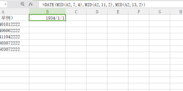 7.可以拖拽或双击B2单元格右下角来填充其他单元格或者如果身份证都是18位可以使用=DATE(MID(A2,7,4),MID(A2,11,2),MID(A2,13,2))这个公式