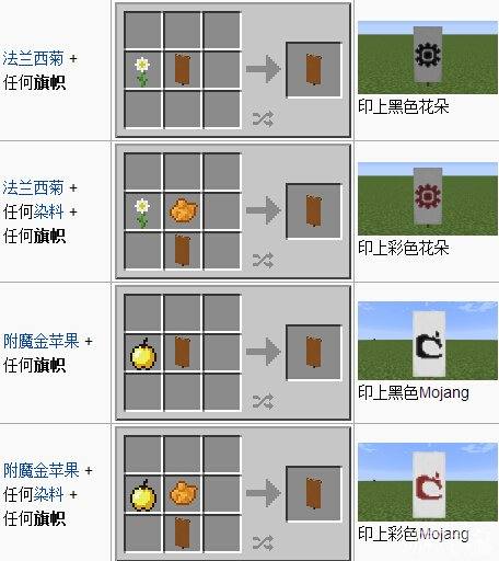 《二》法兰西菊+任何旗帜、法兰西菊+任何染料+任何旗帜、附魔金苹果+任何旗帜、附魔金苹果+任何染料+任何旗帜。
