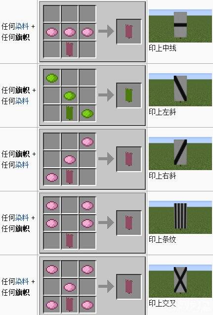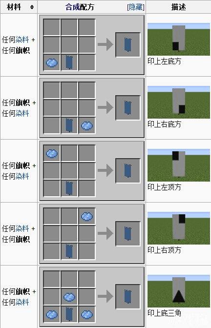 我的世界旗帜合成攻略,这是一种装饰性方块,可以通过染料自由创作旗帜内容,旗帜上有着可以添加很多不同图案的旗面,旗面一共有16种底色,图案也都有16种颜色,每张旗面都可以添加6种不同的图案,旗帜很像木牌,能放置在地上,可以有不同朝向,还能挂在墙上。