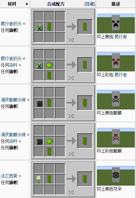 《一》爬行者头+任何旗帜、爬行者头+任何染料+任何旗帜、凋零骷髅头颅+任何旗帜、凋零骷髅头颅+任何染料+任何旗帜、一个法兰西菊+任何旗帜。