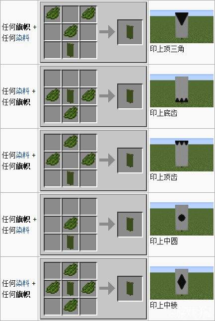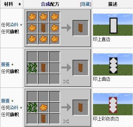 《七》黄色八个任意染料+任何旗帜、一个藤蔓+任意旗帜、一个藤蔓+任意染料+任意旗帜。