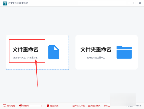 1、打开电脑后打开工具中的优速文件批量重命名2.0.5,然后打开使用,我们批量修改文件名,所以我们点击【文件重命名】功能后进入内页。