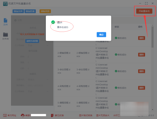 4、点击【开始重命名】按钮启动软件,稍微等待一会,当软件弹出“重命名成功”的提示时,说明文件名批量修改完成。